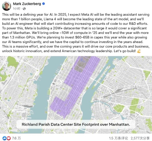 扎克伯格在公开声明中强调,2025年将是“人工智能决定性的一年”。为了实现Meta在AI领域的宏伟目标,包括为10亿人提供Meta AI服务以及使Llama 4成为业界领先的大模型,公司正在加速建设一个规模庞大的数据中心。