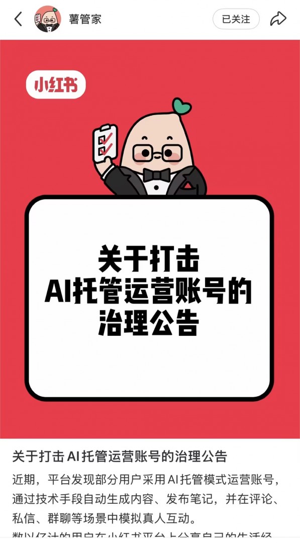 平台将对AI托管类账号实行以下治理措施,1.对于普通账号偶发使用AI托管代写、代发笔记或进行互动,平台严格禁止任何利用技术手段模拟真人、进行非真实内容创作或虚假互动的行为。