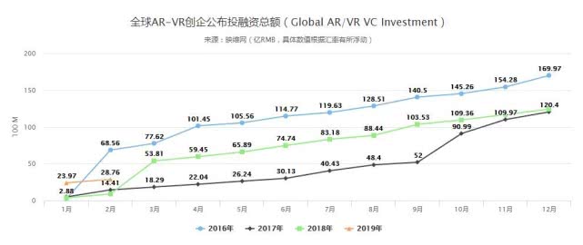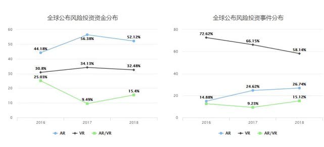 根据中国信息通信研究院发布的《2018 虚拟(增强)现实白皮书》相关数据显示,相较于2016、2017年,2018年与2019年的“全球VR/AR创企公布投融资总额”增长幅度明显放缓。另外从VR/AR相关的“全球公布风险投资资金(事件)分布”数据可以看出,2016年到2018年两年间,全球范围内与VR/AR相关的风险投资事件(资金)下降明显。