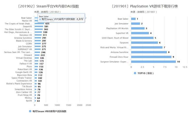 除了行业规模发展变缓之外,VR游戏在近年来的发展也不尽如意,结合2019年2月份Steam平台VR内容DAU指数与2019年1月份Play Station VR游戏下载排行榜来分析。可以看出在Play Steatio上下载排行第一的《Beat Saber》,在Steam上面的月均DAU指数也仅仅只有2272,相比起端游与手游,VR游戏仍然还是小众玩具。