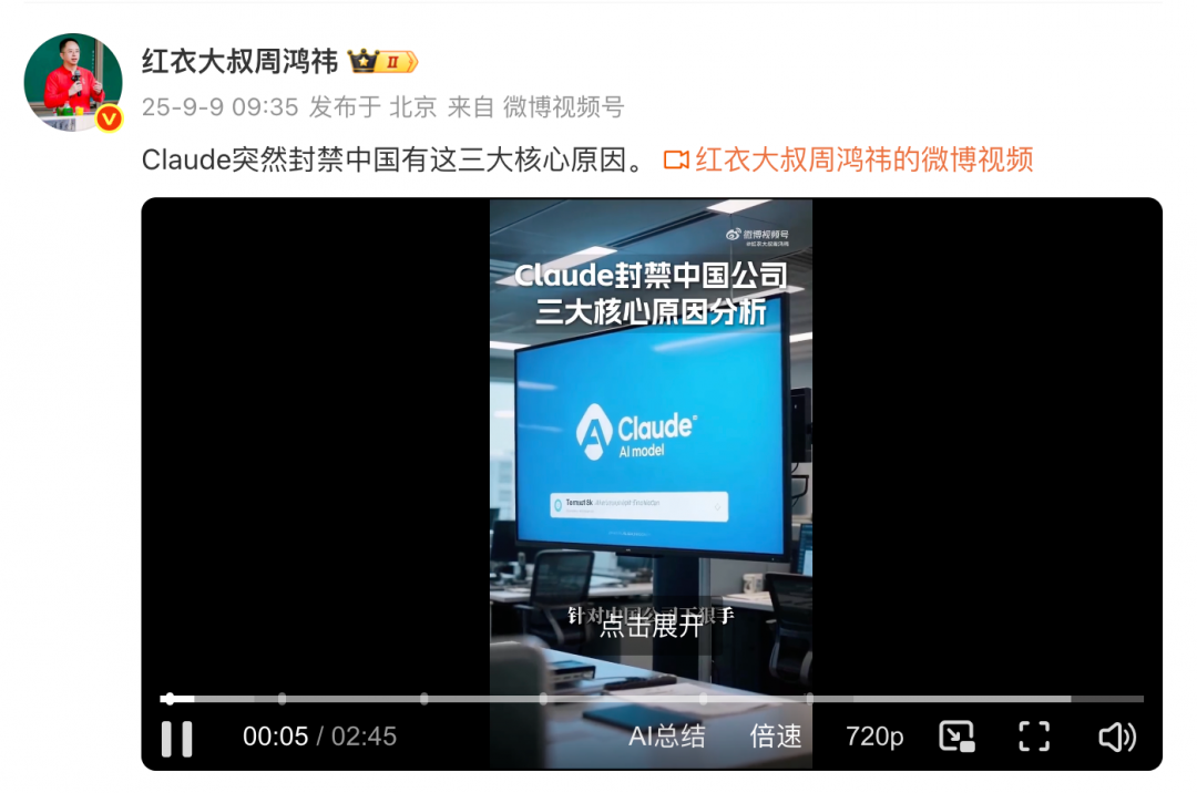 【TechWeb】9月9日消息,今日,360创始人周鸿祎发布视频谈到Claude突然封禁中国的三大核心原因。