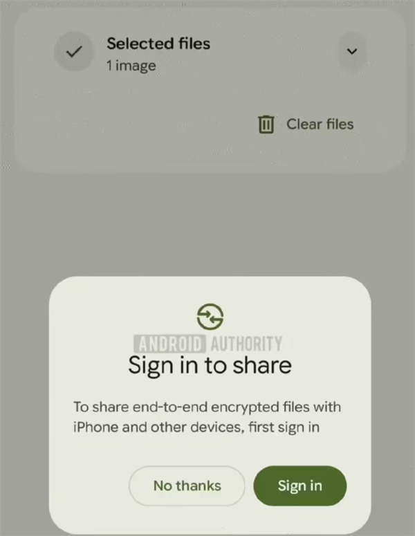这种功能能够在iOS和安卓系统之间实现快速文件传输,谷歌正在为苹果iOS系统开发一款兼容安卓的,弹窗提示用户在共享文件前需要先登录谷歌账号。