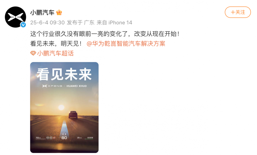 【TechWeb】6月4日消息,今天,小鹏汽车和华为乾崑智能汽车解决方案官微分别发布“看见未来”的海报,配文“明天见”,并相互@对方,预示着双方将有新合作。