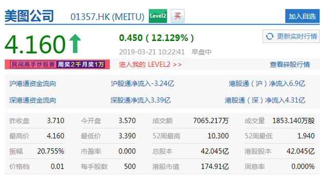 3月21日上午消息,截至10:22,美图公司(01357.HK)盘中大涨12.13%,报4.16港元。