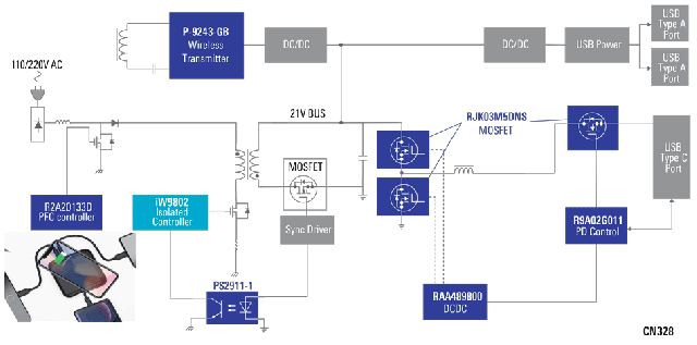 瑞萨100W PD适配器是一款多功能PD适配器,支持65W最大PD输出、BC1.2快充、Qi 15W无线充电、两个5V2.1A USB A接口。现在包括最新的Dialog高功率密度AC/DC芯片组(初级侧数字反激控制器/次级侧接口IC),具有先进的零电压开关以及瑞萨电子的USB PD控制器、MOSFET、PFC和无线充电设备。