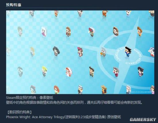 玩家们在Steam预购游戏还可以获得限定预约特典,以下为Steam商店简介,成步堂精选集》已于今日上架了Steam商店。