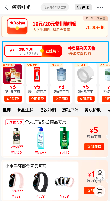 目前,通过京东认证的大学生用户及京东PLUS会员每晚8点可领域“满15元减10元”、“满40元减20元”两种大额餐补优惠券。具体方法,通过京东App首页-秒送-品质外卖入口领取。