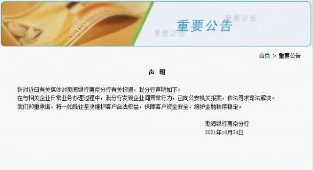 10月24日凌晨,渤海银行南京分行发布声明称:发现企业间异常行为,已向公安机关报案,依法寻求司法解决,并承诺将一如既往坚决维护客户合法权益,保障客户资金安全,维护金融秩序稳定。