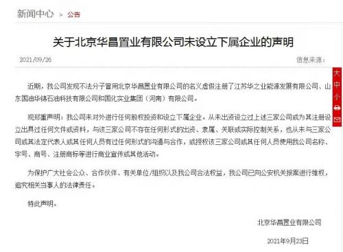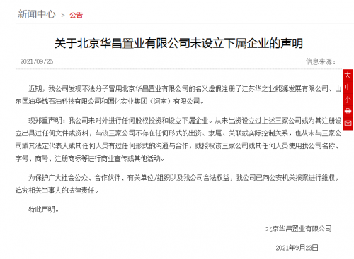 不过,早在9月23日,中石油就在官网发表过一则声明,称公司发现不法分子冒用北京华昌置业有限公司的名义虚假注册了江苏华之业能源发展有限公司、山东国油华锦石油科技有限公司和国化实业集团(河南)有限公司,公司未对外进行任何股权投资和设立下属企业。
