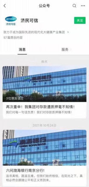 【TechWeb】11月4日,济民可信微信公众号发布《再次重申!我集团对存款遭质押毫不知情!》,对渤海银行南京分行的发言做出回应。