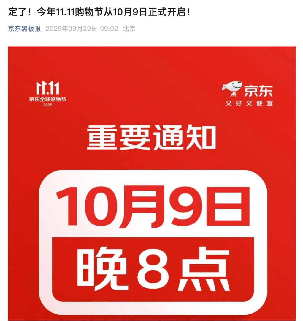 【TechWeb】9月29日消息,一年一度的双11大促即将拉开序幕。今天上午,京东官方公众号“京东黑板报”宣布,今年京东双11将于10月9日晚8点开启。