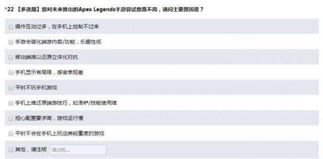 而且这次调查问卷中还问到了《Apex英雄》推出手游后玩家是否感兴趣。腾讯之前已经推出了两个吃鸡手游,分别是天美工作室开发的《绝地求生:全军出击》和光子工作室开发的《绝地求生:刺激战场》。如果说网游没有成行,《Apex英雄》倒有可能再和其他吃鸡手游同台竞技。