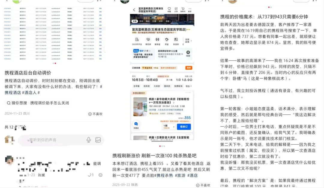 上述情况在用户端也得到了证实。有用户在社交媒体上吐槽携程会用“价格魔术”:“因为要去出差,在下午16:19分用自己的携程账号搜索单人房价格为737元,同事那边查询为873元。对比仅用了5分钟,随后准备订房时却发现价格一间飙升至943元。”