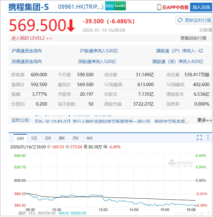 盘面上,或受此消息影响,携程港股尾盘直线下跌,截至收盘报569.5港元/股,跌6.49%。