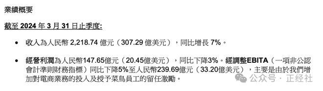 以2024财年四季度财报为例,虽然整体营收增长了7%,但是经营利润却只有147.65亿元,同比下降了3%;净利润更是同比下降了96%,只有9.19亿元。