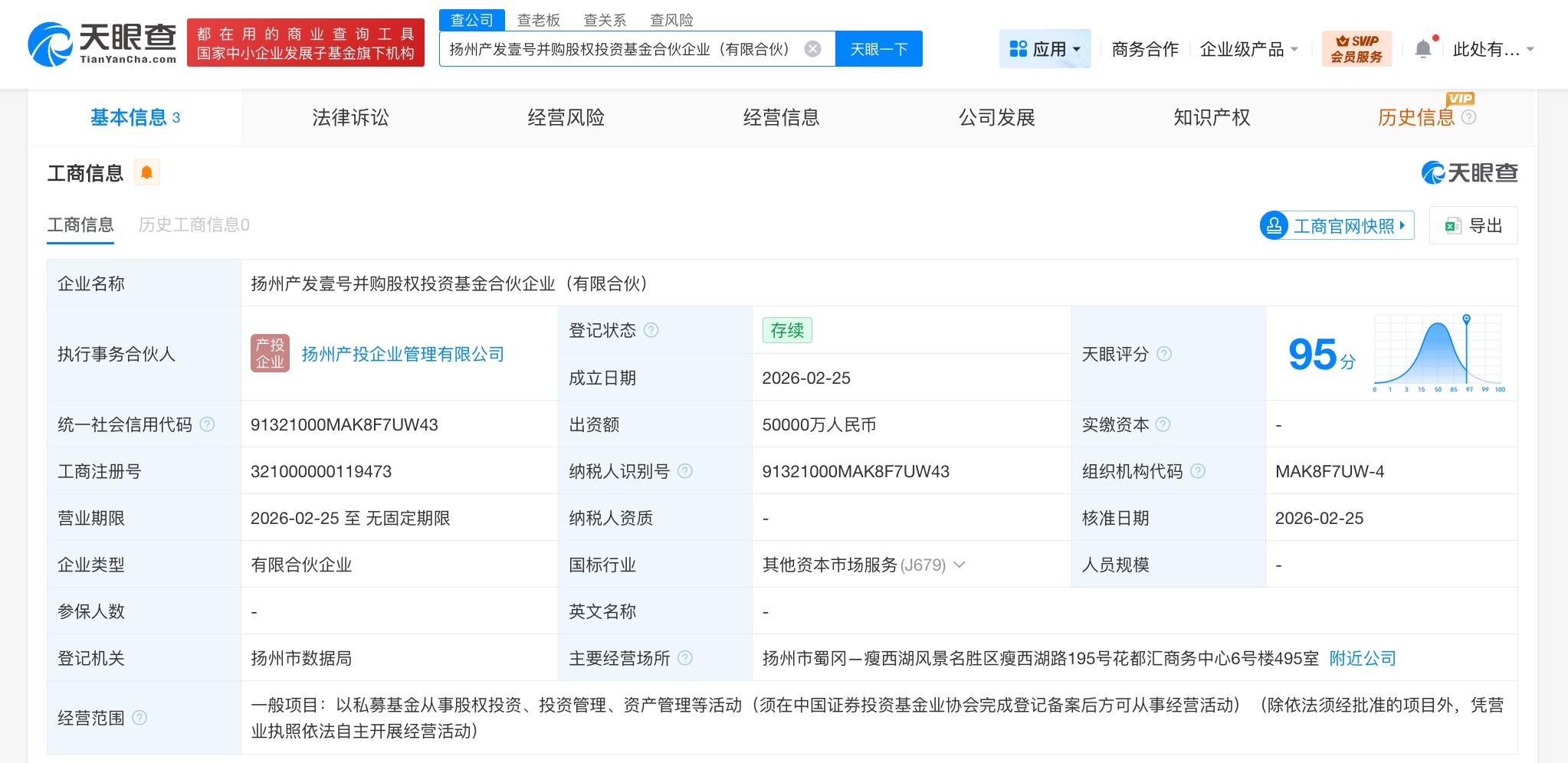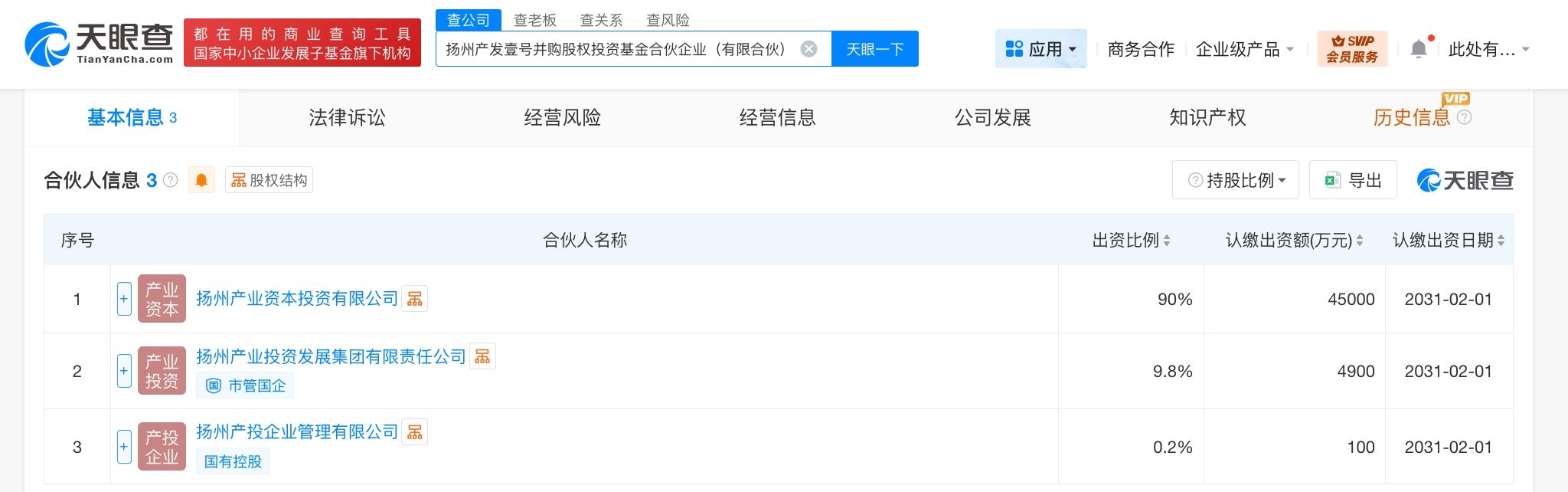 天眼查App显示,近日,扬州产发壹号并购股权投资基金合伙企业(有限合伙)成立,执行事务合伙人为扬州产投企业管理有限公司,出资额5亿人民币,经营范围为以私募基金从事股权投资、投资管理、资产管理等活动。合伙人信息显示,该基金由扬州产业资本投资有限公司、扬州产业投资发展集团有限责任公司、扬州产投企业管理有限公司共同出资。