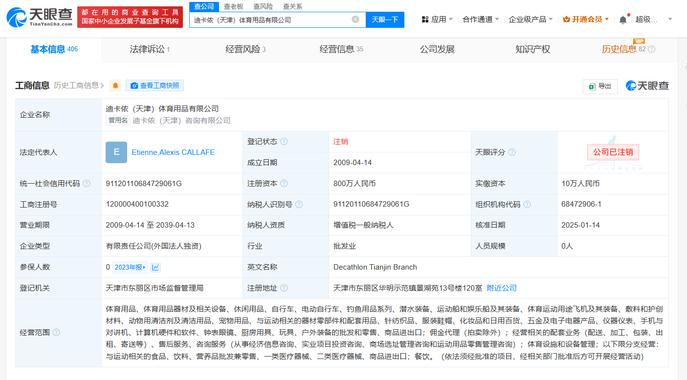 天眼查App显示,近日,迪卡侬(天津)体育用品有限公司经营状态由存续变更为注销。去年11月,该公司已发布注销备案公告,注销原因为决议解散。