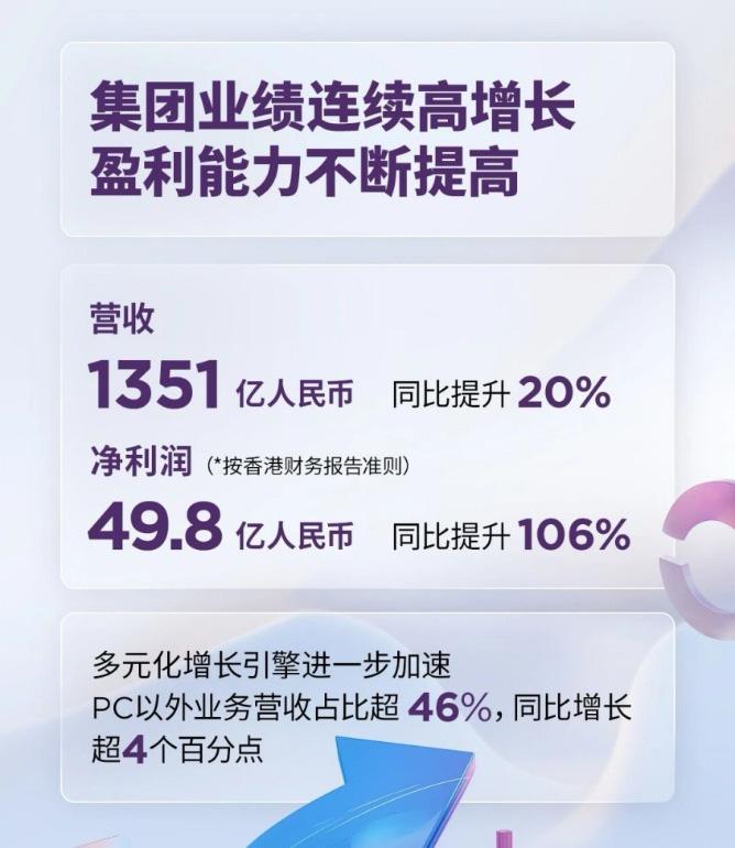 财报显示,报告期内,联想集团实现营收1351亿元,同比增长20%,三大主营业务均实现双位数增长。利润增长幅度扩大,按照香港财务报告准则下的净利润同比增长106%至49.8亿元。多元化增长引擎持续加速,PC以外业务在集团总营收占比超过46%。