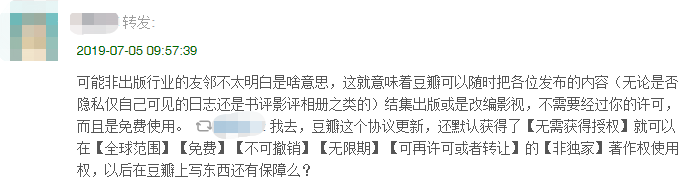 上面也有人提到说豆瓣可以把用户发的内容拿去出版,不用再通知作者(毕竟你点击同意就是授权了),虽然说这种事发生的概率可能很小,但的确存在有这种风险。你将不知道自己的内容会以什么形式出现在什么地方,没准还以为是被盗用呢,结果豆瓣说你已经同意过授权了,就……凭什么啊!