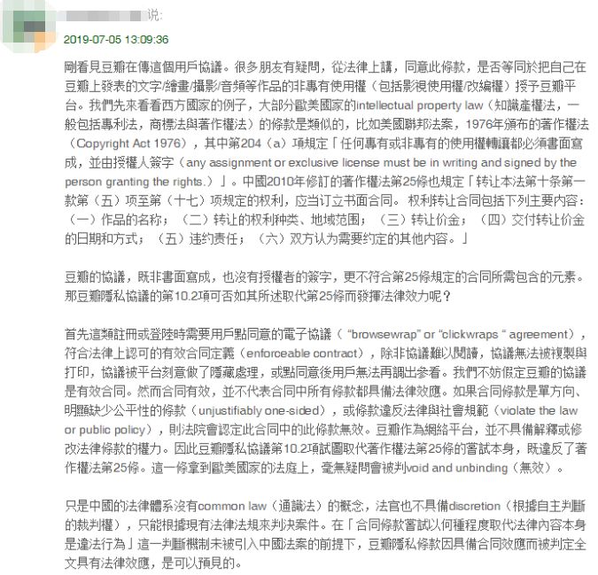 那如果一个普通作者,他的本意是将自己的文字或其他形式的作品进行出版、影视/漫画改编等版权操作,同时他会在豆瓣上传自己的作品来与大家分享、互动,那当他同意了这份协议将意味着什么呢?结合律师的回复,我给大家做一点说明。