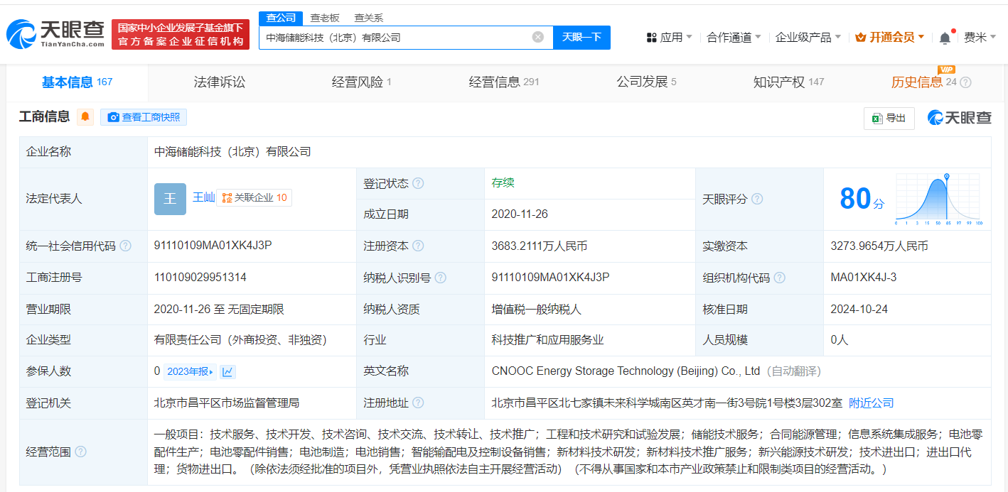 中海储能科技(北京)有限公司成立于2020年11月,法定代表人为王屾,经营范围含工程和技术研究和试验发展、储能技术服务、合同能源管理、电池零配件生产、电池零配件销售等,现由王屾、北京中海储能企业管理中心(有限合伙)、曾建华及上述新增股东等共同持股。官网显示,中海储能专注于新型大容量电化学储能产品——铁铬液流电池储能系统的研究开发。