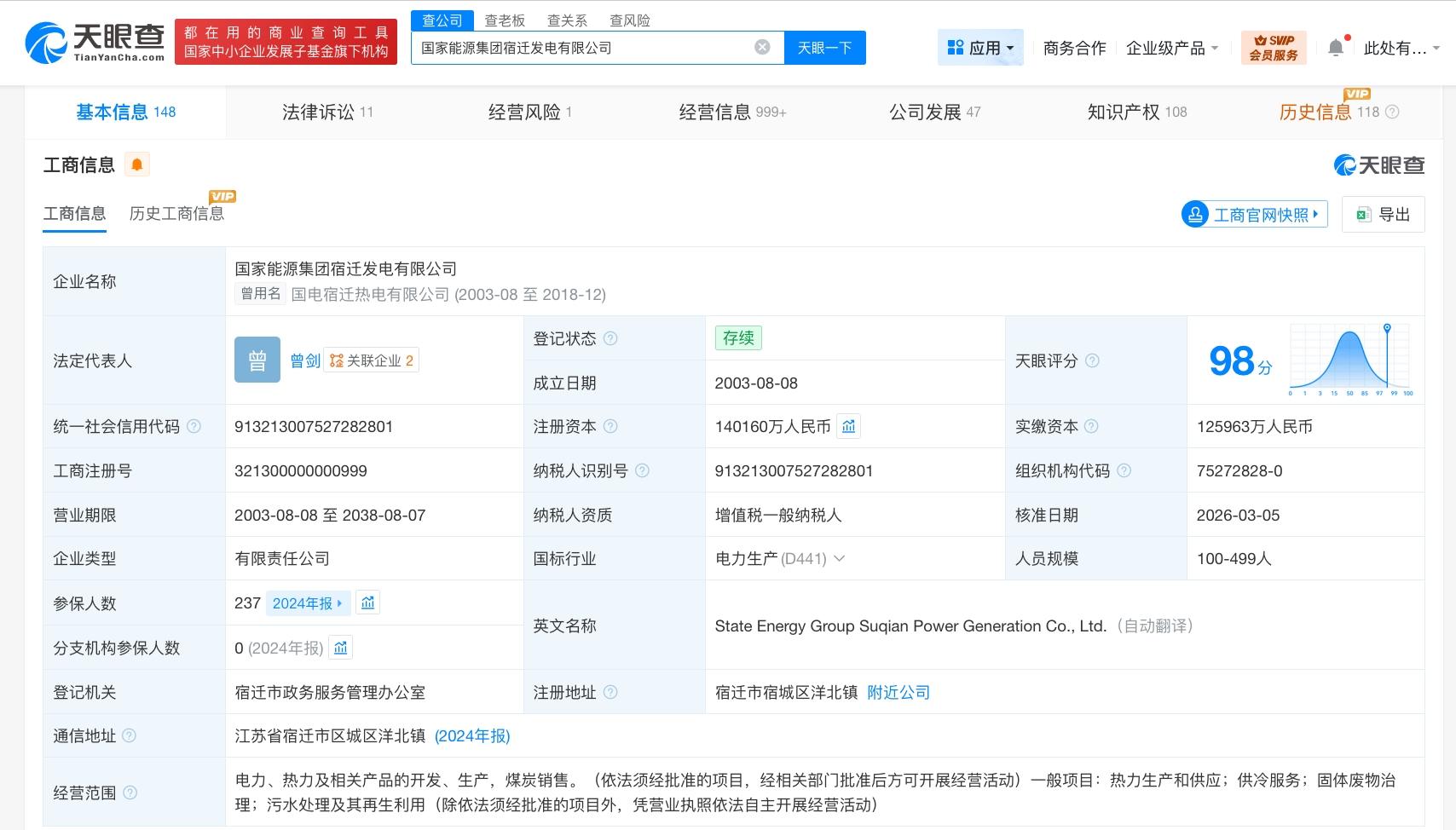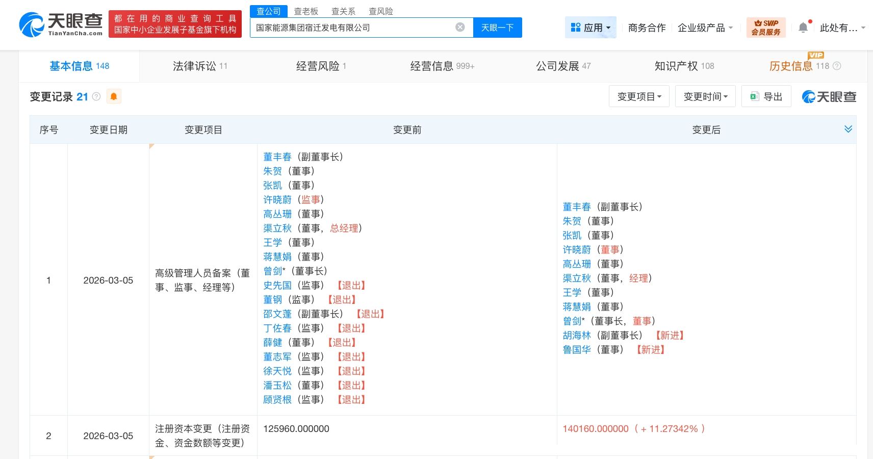 天眼查工商信息显示,近日,国家能源集团宿迁发电有限公司发生工商变更,注册资本由约12.6亿增至约14亿,增幅约11%,同时,部分高管发生变更。