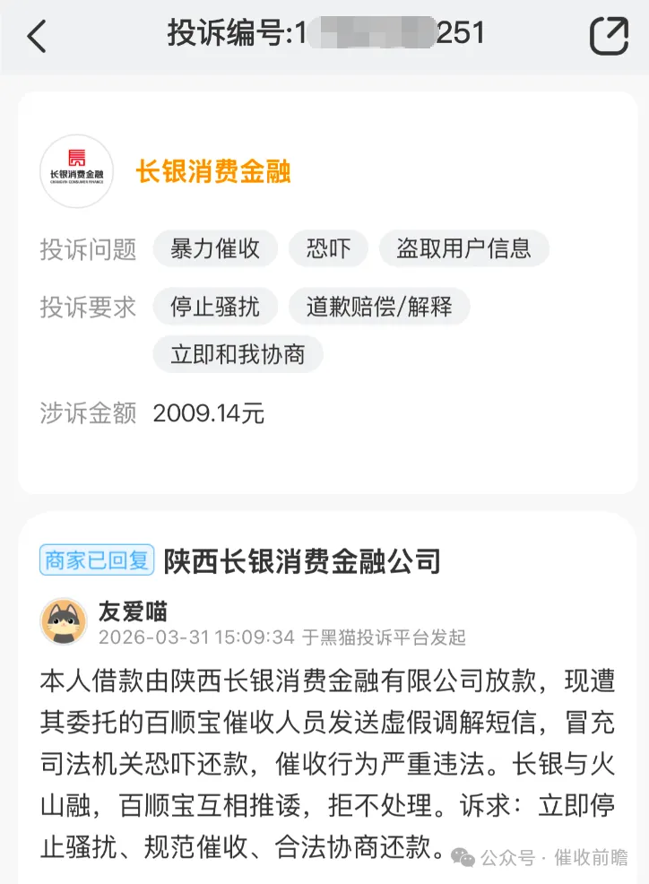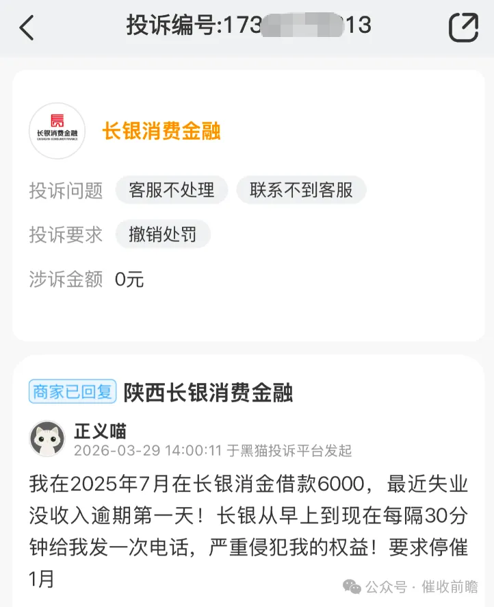 2026 年 3 月下旬,黑猫投诉平台接连出现针对陕西长银消费金融的催收投诉。一位用户反映,2025 年 7 月在该平台借款 6000 元,因近期失业暂无收入,逾期首日便遭遇高频催收,从早到晚每隔 30 分钟就接到催收电话,严重干扰正常生活,用户明确提出暂停催收一月的合理诉求,却迟迟得不到有效回应。