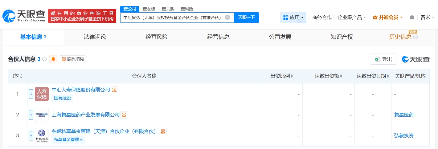 天眼查工商信息显示,近日,中汇复弘(天津)股权投资基金合伙企业(有限合伙)成立,执行事务合伙人为弘毅私募基金管理(天津)合伙企业(有限合伙),出资额5.47亿人民币,经营范围为以私募基金从事股权投资、投资管理、资产管理等活动。合伙人信息显示,该基金由中汇人寿保险股份有限公司、上海复星医药产业发展有限公司、弘毅私募基金管理(天津)合伙企业(有限合伙)共同出资。