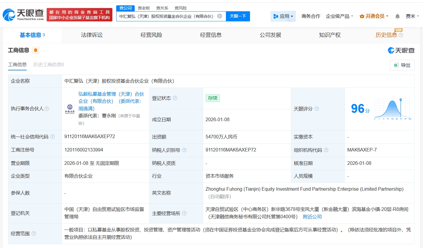 天眼查工商信息显示,近日,中汇复弘(天津)股权投资基金合伙企业(有限合伙)成立,执行事务合伙人为弘毅私募基金管理(天津)合伙企业(有限合伙),出资额5.47亿人民币,经营范围为以私募基金从事股权投资、投资管理、资产管理等活动。