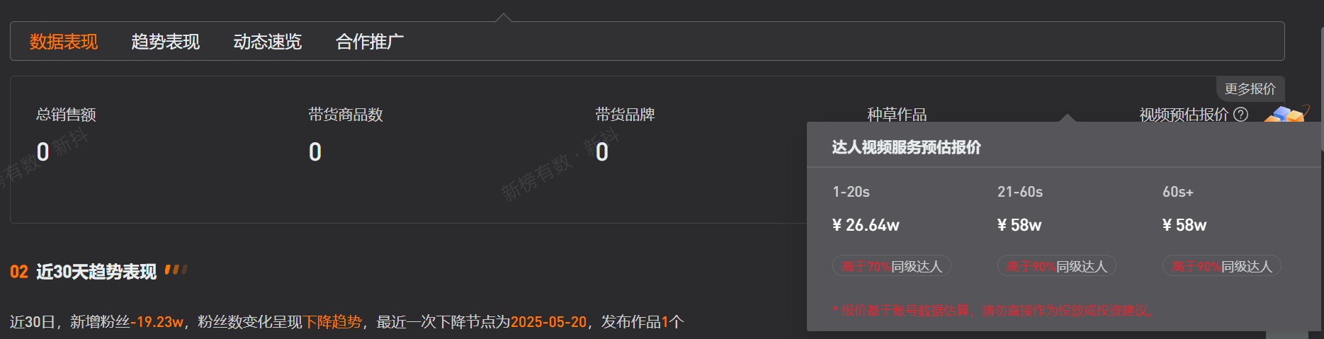 第三方数据显示,疯产姐妹视频平台账号6月18日粉丝量为2990.3万,近30日掉粉超19万。此外,该账号1-20s视频预估报价为26.64万,21-60s视频预估报价为58万,60s+视频预估报价为58万。