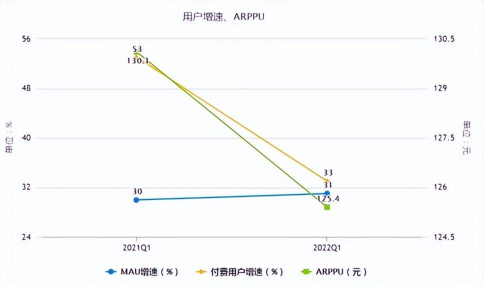 但是看更直接的ARPPU数据,2022Q1为125.4元,去年同期为130.1元,同比减少4.7元。虽然付费用户变多,但是平均付费却下降了,这也是目前直播、音视频等赛道面临的共同问题。