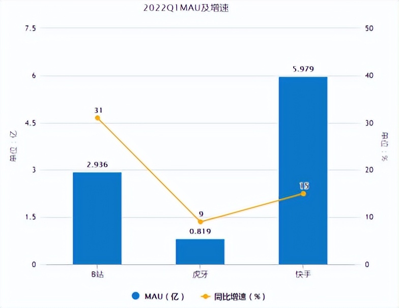 但B站的增长质量到底怎么样?以用户规模为例,B站2022Q1MAU同比增速为31%,与虎牙、快手等相比,仍保持在一个比较可观的速度上。