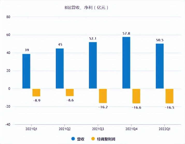 刚刚过去的2022年一季度,B站的经调整净亏损并未缩小,且营收环比还有下降,而在同比维度上,更多的营收伴随着更多的亏损,并没有改善。
