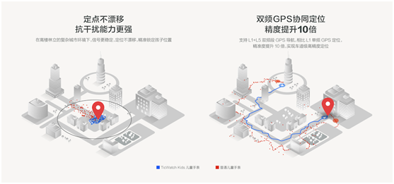 值得一提的是,TicWatch Kids利用双信号协同,实现了高楼林立的复杂城市环境下的车道级定位,相比L1单频GPS精准度提升10倍左右,完全杜绝了同行儿童手表容易出现的定位漂移等问题,避免APP显示孩子此刻在学校、人却在路上等类似问题,TicWatch Kids是业内支持L1+L5双频GPS定位的儿童手表“少数派”。