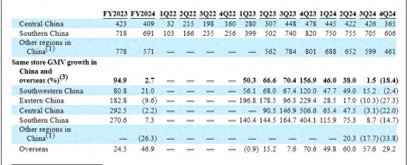 其中,华东区域同店GMV同比下滑27.3%,华中区域同比下滑22.0%,连续两个季度下滑。此外,华南区域、西南区域同店GMV也分别下滑了14.7%和2.4%。