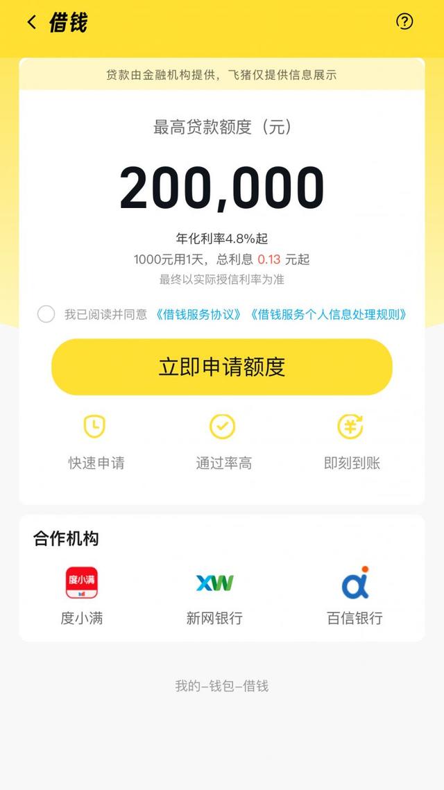 飞猪借钱的合作机构也是三家,包括新网银行、百信银行和度小满,前两家是银行,可以直接发放贷款。