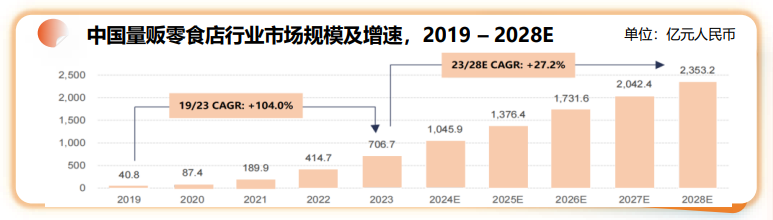 根据头豹研究院数据,中国量贩零食行业规模未来仍将保持高速增长,预计2023年至2028年年复合增长率为27.2%。增长动力主要来源于开店空间广阔,以及承接零食消费者从其他渠道的消费转移。