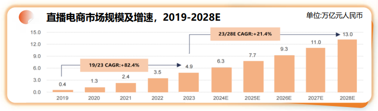 关于拥有更高增长机会的线上渠道,商务部及弗若斯特沙利文披露的数据显示,内容电商通过短视频和直播迅速触达消费者,创造新消费场景,预计2019-2028年年复合增长率为21.4%。