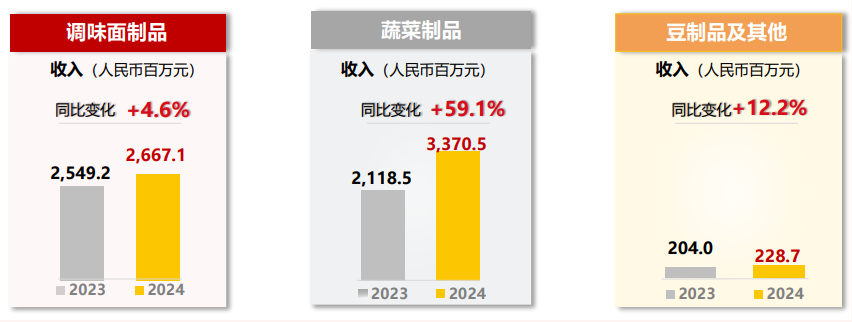 根据财报,期内,卫龙的调味面制品收入同比增长仅4.6%,约为26.67亿元,占总营收比重从2023年的52.3%下降至42.6%,不足一半;蔬菜制品收入大涨59.1%至33.71亿元,占比从43.5%增长到53.8%,成为公司新营收支柱;豆制品及其他产品收入同比增长12.2%至2.29亿元,占比下降至3.6%。