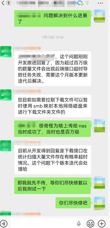 绿联技术部门曾给出回应称,“下载接口在统计扫描大量文件时,存在概率性超时情况,该问题将在后续版本迭代中处理”,但截至投诉时,该功能缺陷始终未得到修复解决。