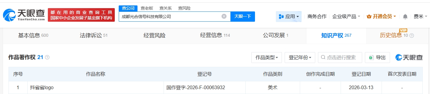 天眼查知识产权信息显示,近日,成都光合信号科技有限公司登记“抖省省logo”作品著作权,作品类别为美术。值得一提的是,今年1月,北京字跳网络技术有限公司申请注册多枚“抖省省”商标,国际分类包括科学仪器、网站服务、医疗园艺等,当前商标状态均为等待实质审查。