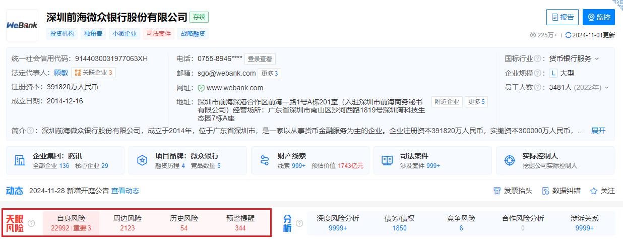 天眼查还显示,微众银行自身风险超过22000条,周边风险超过2000条,其中涉及大量法律纠纷。