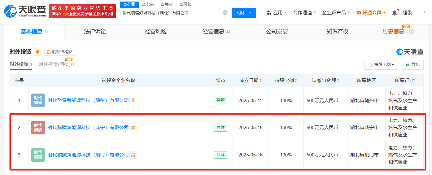 天眼查App显示,近日,时代骐骥新能源科技(荆门)有限公司、时代骐骥新能源科技(咸宁)有限公司成立,法定代表人均为熊洪瑞,注册资本均为500万人民币,经营范围包括新兴能源技术研发、新能源汽车换电设施销售、新能源汽车整车销售等。