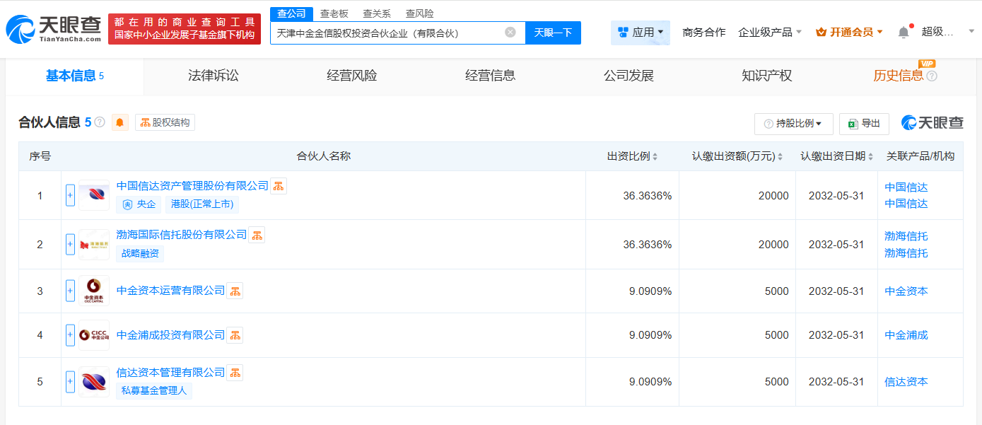 天眼查App显示,近日,天津中金金信股权投资合伙企业(有限合伙)成立,执行事务合伙人为中金资本运营有限公司,出资额5.5亿人民币,经营范围为以自有资金从事投资活动。合伙人信息显示,该合伙企业由中国信达资产管理股份有限公司、渤海国际信托股份有限公司、中金资本运营有限公司等共同出资。