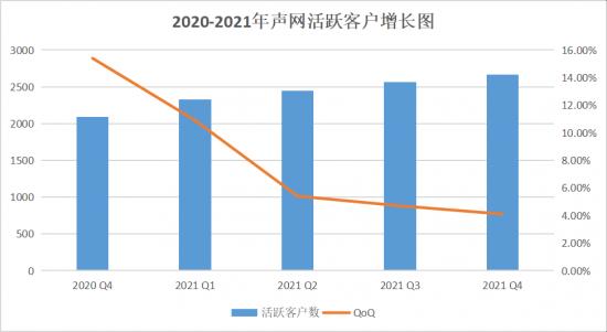 第一,声网的几个比较重点的财务指标表现突出,据财报数据显示,2021年Q4声网实现了4039万美元的总营收,较上年同期的3325万美元,增长21.5%。从年度数据看,2021全年,声网总营收1.68亿美元,较2020全年1.34亿美元的总营收,增长了25.8%。