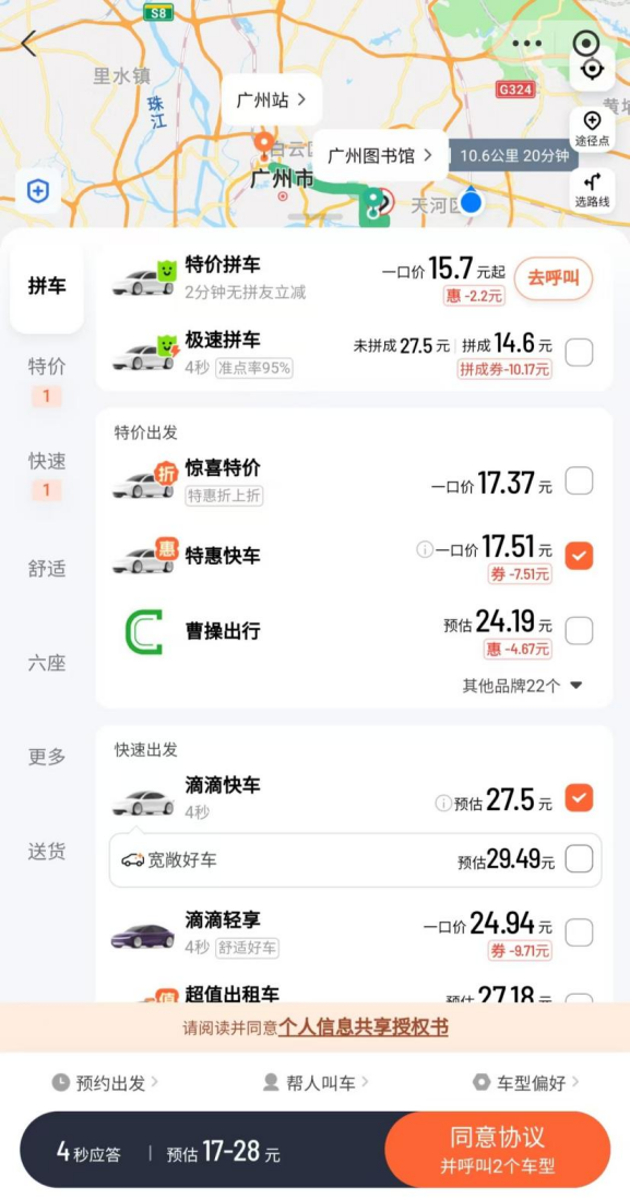 以广州图书馆至广州火车站为例,高德地图提供的经济型最低价仅需13元,而滴滴即使是特价拼车方案,一口价也要15.7元起。