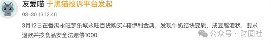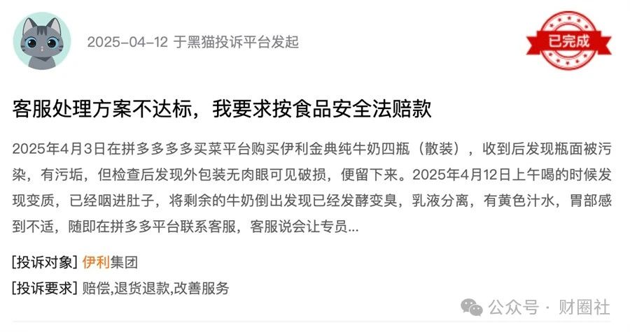 在黑猫投诉平台上关于伊利的产品投诉数不胜数。有网友投诉购买牛奶后发现结块变质。除了零售商的责任,伊利似乎也难辞其咎。