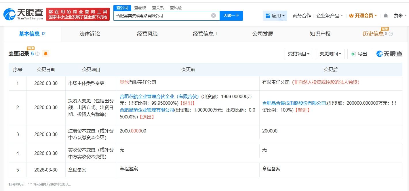 天眼查App显示,近日,合肥晶奕集成电路有限公司发生工商变更,原股东合肥芯航企业管理合伙企业(有限合伙)、合肥晶策企业管理有限公司退出,新增晶合集成(688249)为全资股东,同时,注册资本由2000万人民币增至20亿人民币,增幅9900%。