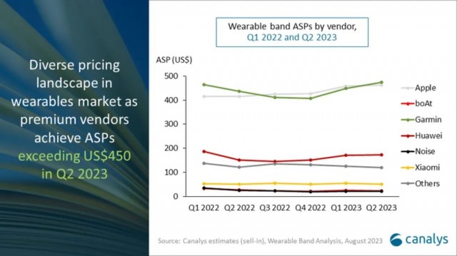 与Fire Boltt类似的是小米,尽管旗下也推出了售价1500元左右的智能手表产品,但市场主销和主推的依然是小米和Redmi的智能手环和基础款智能手表。Canalys的统计数据也说明了这一点,小米可穿戴产品的销售均价不到100美元,只比boAt、Noise这些单纯追求低价的品牌稍高。