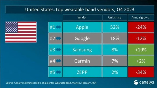 根据Canalys公布的最新数据,2023年第四季度,全球智能可穿戴设备(包括手环、智能手表)的出货量为4850万台,同比下跌3%,Canalys认为下滑主要受北美和西欧市场高通胀和需求疲软的影响。